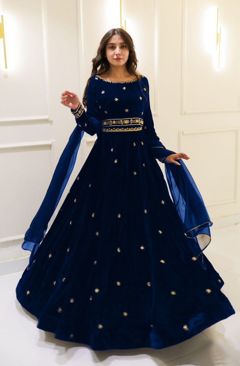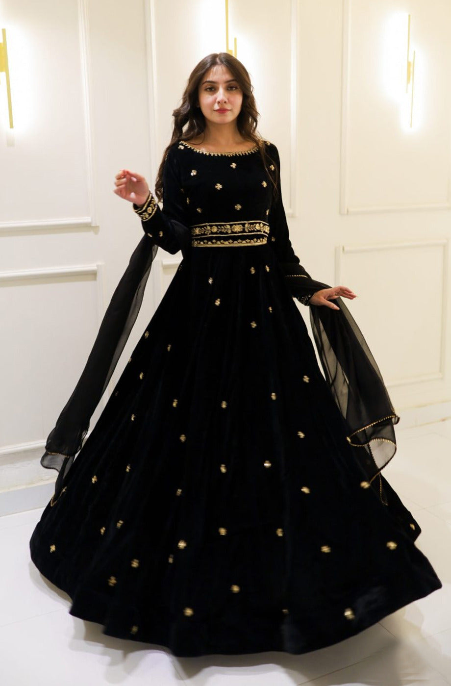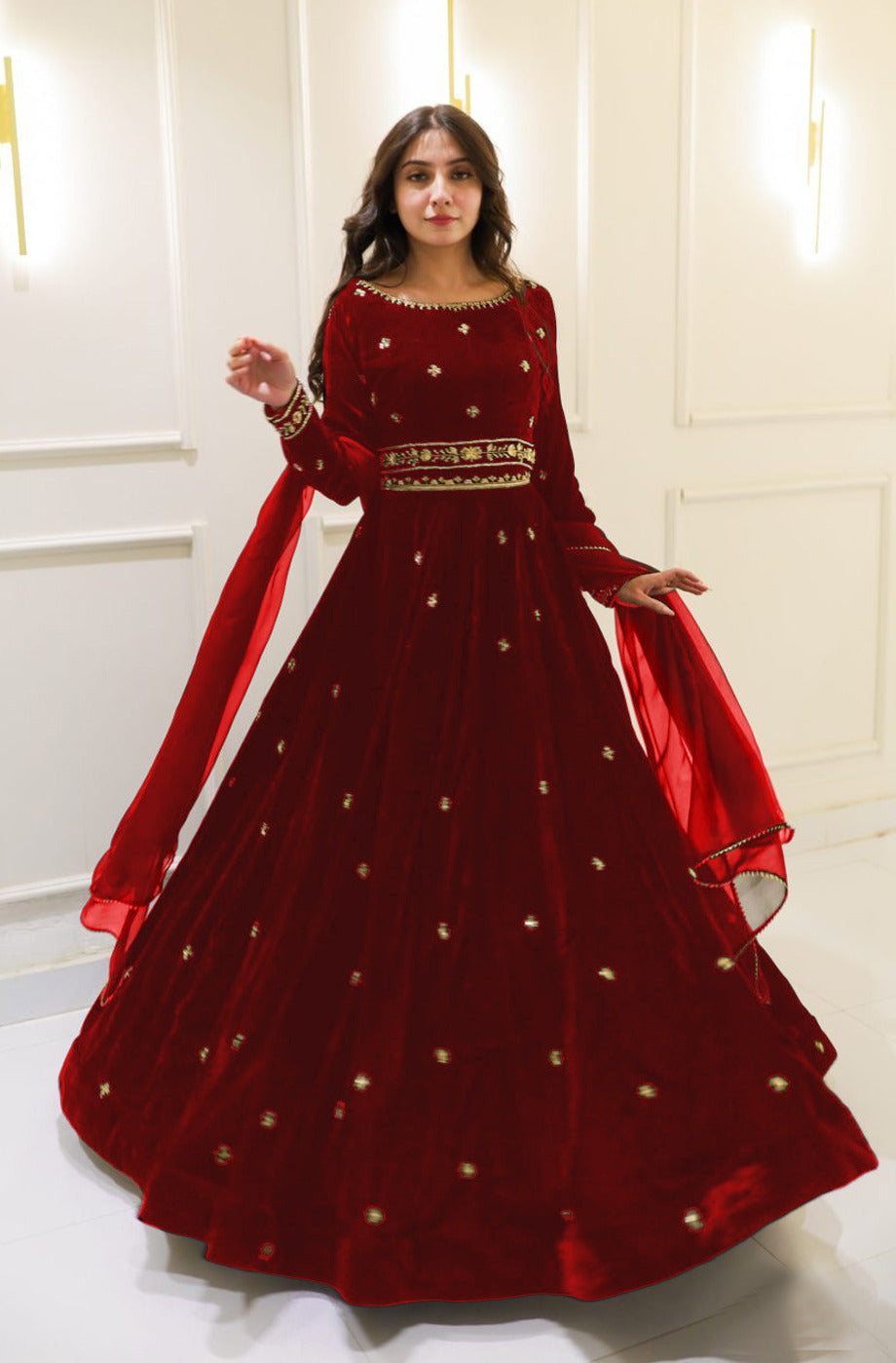 Neck,Sleeves Border Embroidered Top With Embroidered Skirt And Lace Work Dupatta Velvet 3Pcs